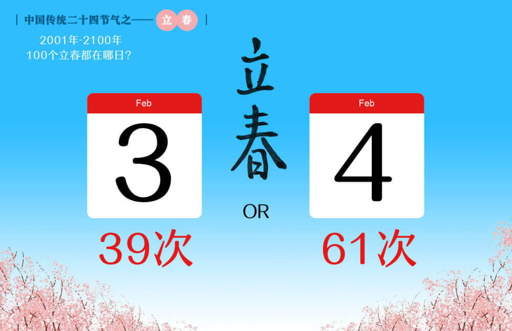 近几年立春的具体时间 2023年立春时间:2月4日 10:42:21,农历 2023年正月(小)十五 2024年立春时间:2月4日 16:26:53,农历 2023年十二月(大)廿五 2025年立春时间:2月3日 22:10:13,农历 2025年正月(大)初六 2026年立春时间:2月4日 04:01:51,农历 2025年十二月(小)十六 2027年立春时间:2月4日 09:46:00,农历 2026年十二月(小)廿八 2028年立春时间:2月4日 15:30:53,农历 2028年正月(大)初十 2029年立春时间:2月3日 21:20:25,农历 2028年十二月(大)二十 2030年立春时间:2月4日 03:08:04,农历 2030年正月(小)初二 2031年立春时间:2月4日 08:57:55,农历 2031年正月(小)十三 2032年立春时间:2月4日 14:48:32,农历 2031年十二月(大)廿四 2033年立春时间:2月3日 20:41:08,农历 2033年正月(小)初四 2034年立春时间:2月4日 02:40:41,农历 2033年十二月(大)十五 2035年立春时间:2月4日 08:31:04,农历 2034年十二月(大)廿七
